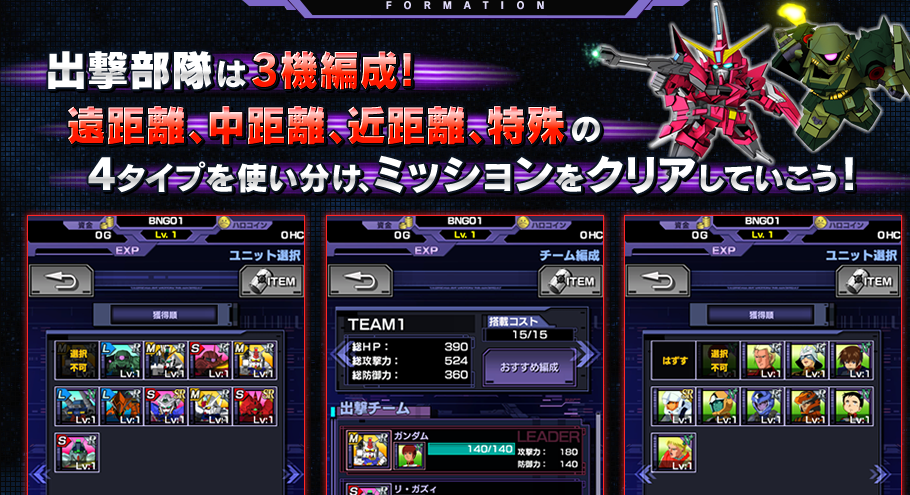 游戏以3部机体出击,分为近距离 远距离 中距离 特殊,不同机体特性不同,玩家可根据任务自行搭配。