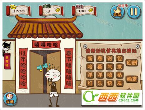 1.注意对联其实就表达一个意思--嘻嘻哈哈,因此横批就是“嘻嘻哈哈”,只要依次点击对应的字,最后点击确定就可以过关咯!