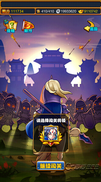 3、孙尚香:纯输出型的单体武将,技能1暗杀后排单体敌人,造成1.7倍伤害并恢复自身1点怒气,技能2单体攻击,造成2.5倍伤害并有60%概率连击,连击概率随连击次数递减,最多可连击6次,单体输出能力非常强同样是单骑闯关的好手。