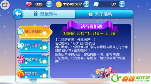 活动期间,分享游戏内任意内容至朋友圈或QQ空间即送18钻石+宠物蛋5个!新春版即将开启,你期待的一切,都即将来临!以钻为礼,以宠为喜,与朋友一起分享奔跑的乐趣吧!