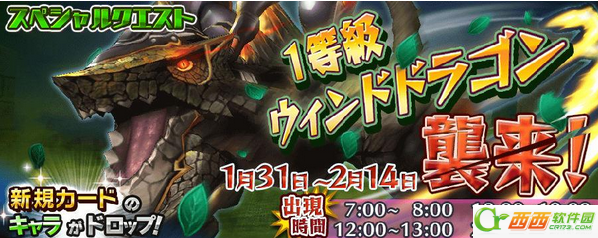 新外敌【1等级风龙】将在1月31日6:00(北京时间)开始出现,击倒他可以获得光属性 ★5(UR)華恋型ブリーセン和MR进化素材,超弩级掉率几率大幅提升哦!
