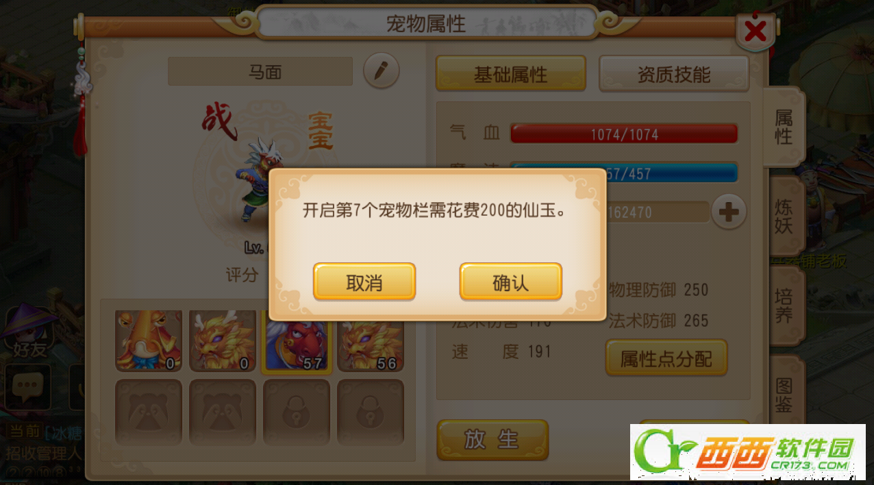 点击之后就能看见是是否启宠物栏的提示界面了!点击确定支付一定的仙玉就能开启了!