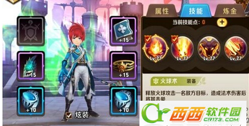 选择操作:可以看到自己在布阵时所放置的三个英雄以及所选职业角色,点击对应的人物可以进入人物介绍面板,包含属性、技能、炼金等,详情则可明白的看到该英雄所对应各个属性内容的最大成长值(可通过炼金以及进阶人物星级提高)。