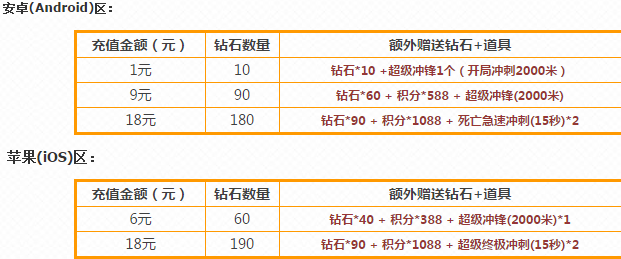 单笔充值额度大于等于18元,额外赠送90钻石 + 1088积分 + 超级终极冲刺2个(死亡冲刺15秒);