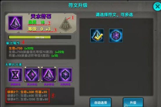 关于升级符文的顺序,笔者个人的优先级是:核心符文>火符文>风符文>水符文>土符文。为什么这样选择呢,因为笔者个人认为攻击比血更重要。大家仔细观察便会发现,在符文全部属性都能被激活的前提下,核心符文感觉加的内容最多,火符文是加三次攻击,风符文是加两攻击一生命,水符文是加一攻击两生命,土符文是加三次生命。当然每个人的游戏思路不一样,认为生命更重要的可以将顺序调转。