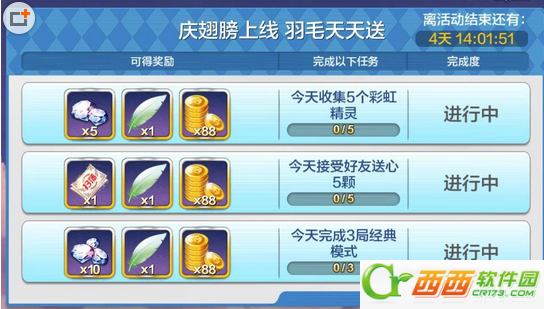 今天收集5个彩虹精灵每日 送 钻石*5、羽毛*1、金币*88