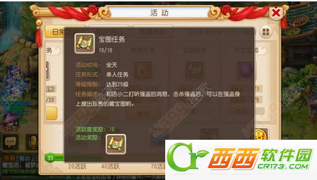 手游中不能像端游那样无限打宝图,每天只能接取10次宝图任务,每次完成宝图任务可以增加1点活跃度,每天可以通过宝图任务获得10点活跃度,活跃度积累到一定额度可以领取相应的活跃度奖励。