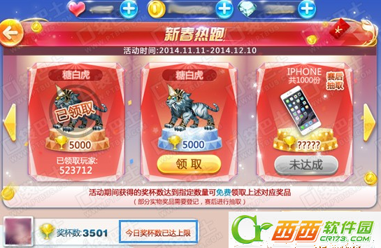 2.新春热跑期间,在多人对战模式中获得一定的奖杯数便可以免费领取对应奖品;
