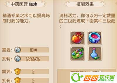 技能效果:消耗活力,可以将一定数量的二级药炼成某种三级药。