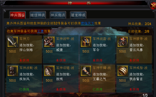 神兵系统分4个功能,分别是神兵图鉴、绝世神装、神兵商店和屠龙神戒。