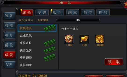 成就系统分为6个模块,分别是:成长、变强、战斗、副本、爵位、称号。