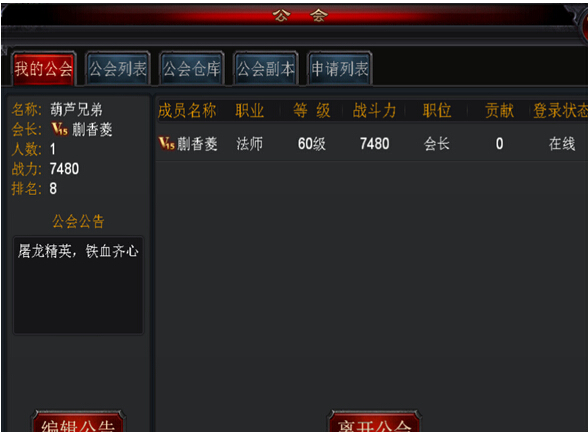 如果你已经加入了公会,打开公会界面之后会显示所在公会会员的详细情况,点击底下的“公会列表”按钮可以查看服务器内其他公会情况;点击“离开公会”即可单飞。