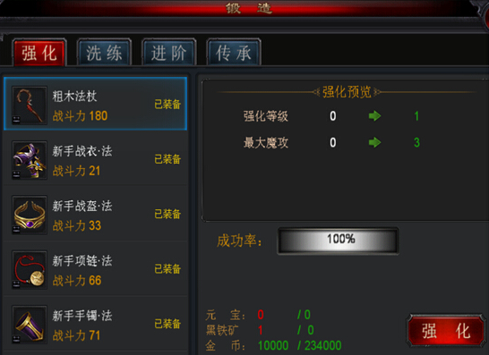 1游戏中的每一件装备都可以强化,根据装备特点不同,强化可以使其等级、战斗力、物攻、物防、魔攻、魔防等等属性有所增益。