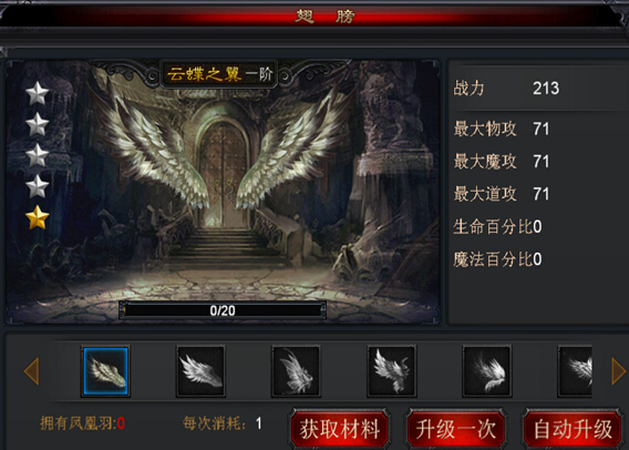 目前翅膀共有10阶,每阶翅膀等级分四星,共四个小等级,消耗“凤凰羽”能够增加经验条经验。每次升星和进阶均可获得大量属性。