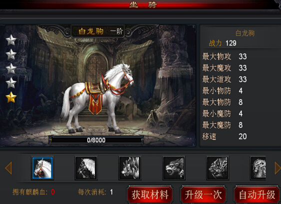 坐骑目前一共有9阶,每阶分4星,升星满后就会自动进阶。每次升星和进阶均可获得大量属性。