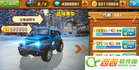 越野吉普车是游戏中我们拥有的第一辆车,是系统免费赠送给我们的。越野吉普车的属性和成长性都很差。它的最高性能评分是601,但是当我们进行到第2章关卡的第2关时,关卡对赛车的评分要求就到了603分了。所以吉普越野车是无法应对后面的战斗的。小编建议越野吉普车不需要培养,而是把金币攒下来买一辆肥皂车好了。