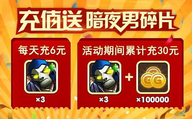 2. 活动期间,累计充30元,再送暗夜男碎片*3,金币10万