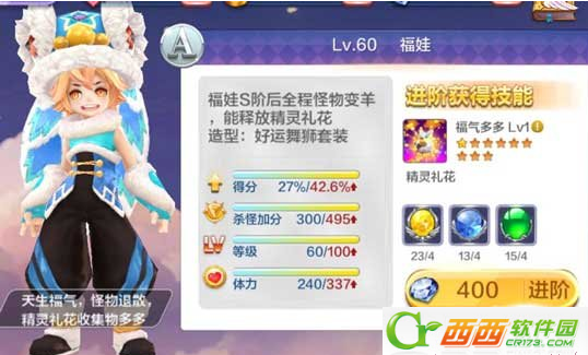 进阶技能:福气多多,放收集物礼花,满级技能触发是攻击4只羊