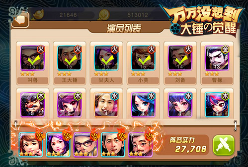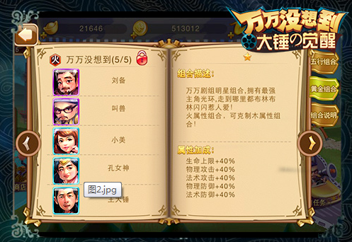 万万没想到,你也会觉醒体了?万万没想到阵容那是相当的强劲,由叫兽、王大锤、小美、孔连顺、刘备组成的万万没想到阵型,不仅可以获得40%的全属性加成,还能让各自的技能火力全开,分分钟让你感受到什么是真正的觉醒。不过万万没想到组合隶属于火属性组合,可以克制木属性宿敌组合,但遇到水属性的组合,就要小心了哦。