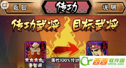 觉醒的属性可传功,传功就是把一个武将已经觉醒的属性转移给另一个武将。传功要求目标武将的进阶等级不得低于传功武将,也就是说同级是可以的。传功需要消耗银票,不过传功是100%的,没有属性损失也没有风险。传功相当于后悔药,可以把不想再用的武将属性值转移给当前正想要的武将。
