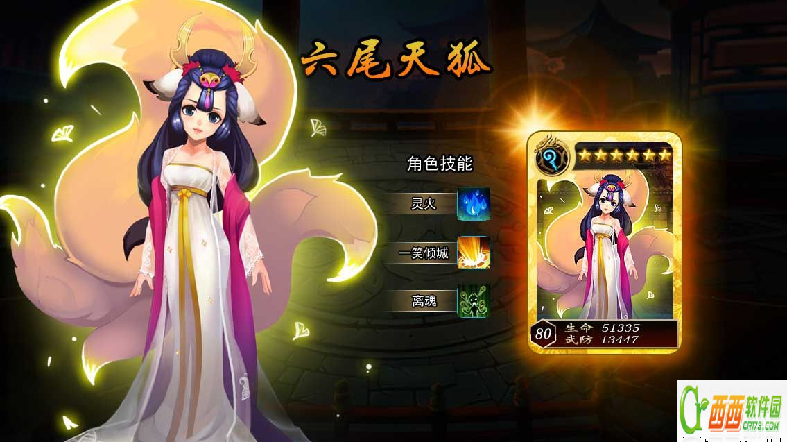 2、一笑倾城:六尾天狐有着绝世之容,她的一颦一笑也能对敌方3个目标造成灵攻伤害。