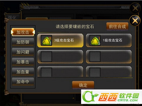 宝石的种类按照所加属性来区分,共有6种,分别可增加血量、防御、攻击、命中、闪避和暴击。每4颗低级宝石可合成1颗高一级的宝石,宝石最高等级10级,高级的宝石属性更强。