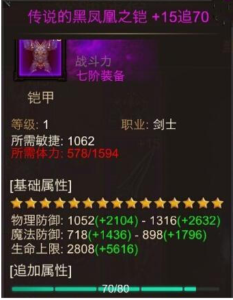 全民奇迹战士七阶紫装黑凤凰之铠属性: