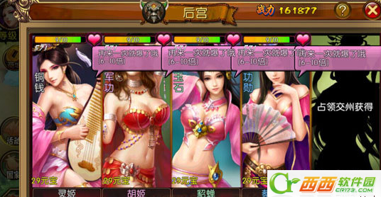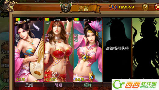 进入后宫之后平时征战所“缴获”各位美人以醉人心脾的姿态赫然呈现在眼前。游戏中玩家通过了特定的关卡之后就能把美人收纳入后宫,而每次临幸美人都会馈赠你礼物。如图所示,不同美人产出的资源都不一样,花费1个元宝即可完成对美人的临幸,并获取其所能产出的资源。右下角的【临幸她们】是一个一键功能,点击便可一次性完成对所有美人的临幸。