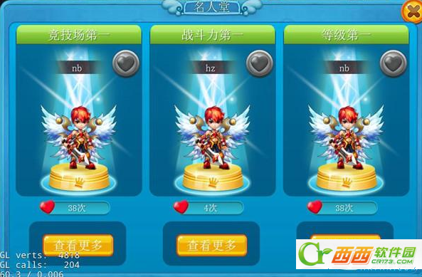 只要玩家在竞技场中斩获殊荣,就有机会进入《热血冒险岛》名人堂,在所有玩家手机上露脸。名人堂主界面分别显示当前游戏中竞技场、战斗力以及等级排名第一的玩家,点击查看更多按钮即可进入详细排名界面。