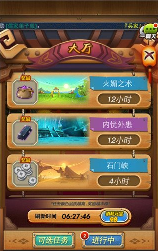 大厅:随机产出银币、精炼材料等(可刷新),选定任务可得资源。