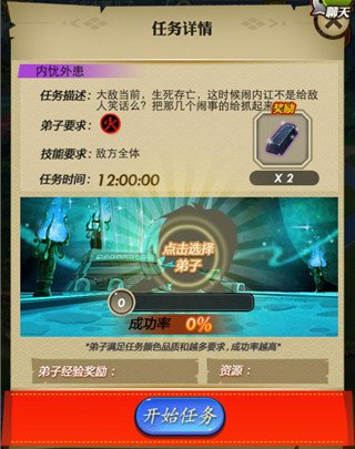 通过颜色分类判定任务的珍贵程度,同时根据任务的珍稀程度设定接受订单所需的各项条件(技能范围、弟子五行属性或攻防定位),条件满足程度越高,获得奖励的成功率越大。大厅等级越高,任务越丰富,任务可选项越多。