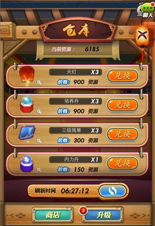 庄园仓库:定时刷新道具(可用资源进行兑换),升级建筑(可用资源进行升级)。