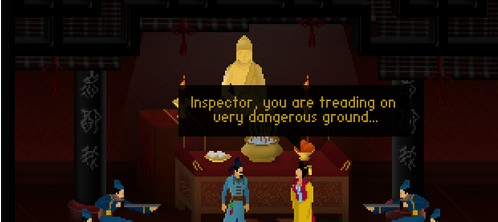 从神探狄仁杰手游的截图可以看出,《Detective Di: The Silk Rose Murders》似乎是借鉴了之前上映的《狄仁杰》系列两部电影的剧情,玩法方面,本作套用了熟悉的冒险类游戏的玩法,比如探索、对话、物品交互寻找线索以及解决一个又又一个谜题。所以大家能明显地感受到《超级兄弟 Superbrothers: Sword & Sworcery》的神韵。