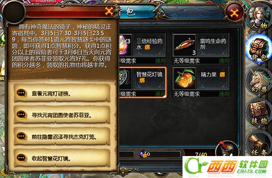 【活动二】欢乐猜灯谜动期间,等级到达30级的冒险者击杀隐雾沼泽的杰克灯笼将有几率获得元宵智慧谜卡,回答正确谜卡上的谜题即可获得奖励与智慧积分,冲击元宵灯谜排行榜!如果你一不小心失手答错了,也可以获得经验哦!所以,不要大意,一鼓作气冲上前三名吧!