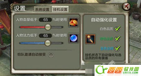 组队邀请自动设置一般不开起来,正常都是组满4个小伙伴去挂机的、右边的自动强化设置是V2才能拥有的,这里推荐玩家可以充值到V2,强化设置可以选择你要强化的装备,一般都是选择武器。然后把要强化的装备阶级白绿蓝全部勾上,这样挂机的时候就不会占用你的包裹。