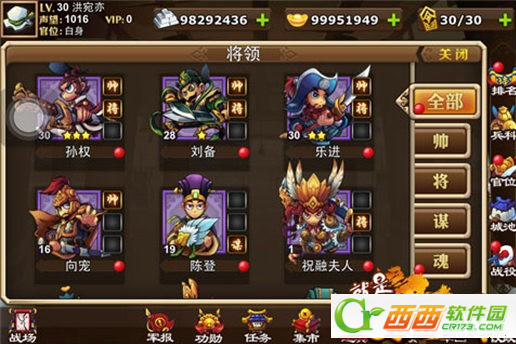 在《就是要三国》中,玩家麾下的每位将领都拥有帅、将、谋三大职业,在安排上阵时,玩家可以自由切换将领的职业。武将担任帅时,可以将行动点分配给将、谋,而将和谋则将使用行动点发出不同的技能。同样的将领,不同的阵容搭配、不同的职业搭配会产生完全不同的效果,玩家也可以在自由的策略选择中感受到更加丰富多彩的游戏体验,快来试试张飞当军师,孔明当猛将的感觉吧!