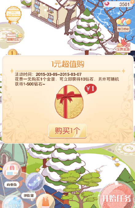 2015.3.5-2015.3.7活动期间内(即日起到周六24:00)开启1元超值购,1元可以购买10钻石,另随机赠1~500钻石,购买次数不限,可以试试运气哦!