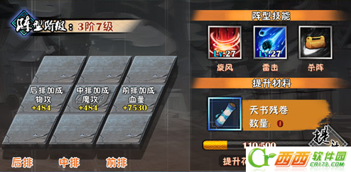 阵型升级后可以给站在相应位置的神将增加属性,后排加物功-中排加魔攻-前排加血量。天数残卷可以通过精英副本获得,也可以去商店碰运气购买。