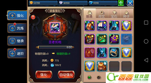①强化:每个装备可以强化20次,战力提升的效果不错,分解也有金币80%的返还。建议装备的强化与否不光看品质,而要看基础的随机属性,这个属性是更改不了。后面强化消耗的金币很多,初级可以随便弄。