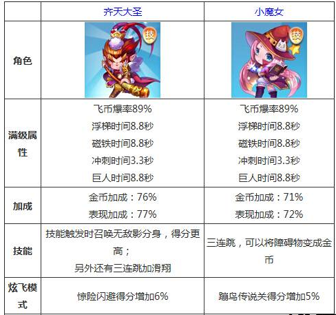 天天酷跑里面人物角色许许多多,而且还在不断的推出新的人物角色,每个角色都有各自的特点,选取一个好的角色也是取得高分的关键,个人的操作、角色的属性、角色的技能无疑都是可以影响玩家是否能够拿到高分数的条件,这次我们来了解一下天天酷跑齐天大圣和小魔女的属性,比较一下这两个人物。