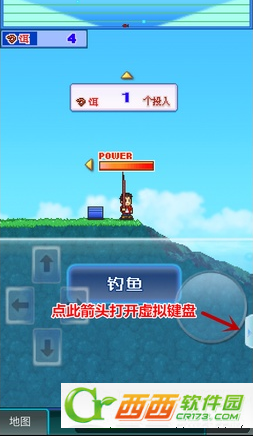 3.有水有鱼了,选择去钓鱼,建议将POWER选择到最高(即满红条),将屏幕右下角的箭头打开虚拟键盘方便操作,接着点击钓鱼。