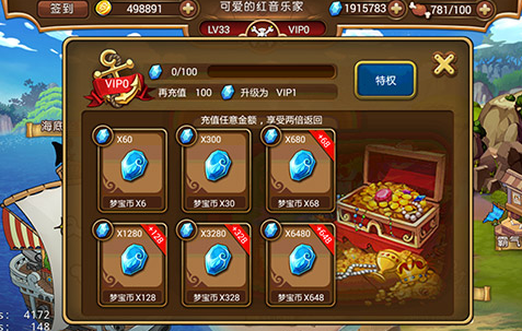 2. V5-V11的第二档,V5入手艾斯、V6监狱双倍、V8钻石洗练、V9珍宝两次、V10白金酒馆都是不错的特权。但是之所以说这之间差距不大,是因为这些档次的玩家都培养不了或最多培养一个紫专属武器的草帽团人物,而如果在上述V级打算重点培养女帝、鹰眼、VV这些土豪人物,那么恭喜你入坑了,要么果断弃号要么继续砸钱,否则看到一群低V整天逆袭你们会觉得很不爽的。而在这个档次,资源的合理支配和角色的合理搭配将比V级来的更加重要。有一定时间,打算长期玩的海贼粉丝建议在此区间充值。