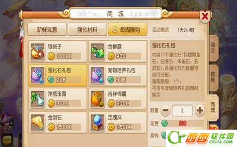 省钱,不代表不花钱,有时候花小钱就能省到大钱。比如在你为游戏充值了648元之后(强烈推荐只充值这个档次的仙玉,理由很简单——送得多),你就能够获取四层奖励,这能够让你每周获得8个三界群雄的青睐,还能每周以298的超值价格买到一个内含17个强化石,强化石数量可由你自由组合的强化石礼包——而如果以单独的零售价计算,这个礼包要价值整整17*20=340仙玉!所以不要以为充值了你就亏了,在日积月累之下,你能获得更多!