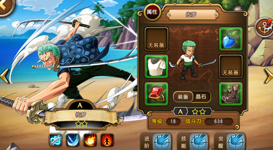 2)索隆:控制能力低(有晕技),抗打击能力较低,输出能力极高,碎片较易容易(航海日历/秘宝/白金酒馆)。中后期高觉才能出场,否则站不住,V9以下由于专属较难获得不推荐上场但是日历照刷。