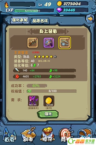 装备强化---强化材料很简单,不管什么装备,强化时只需要一定数量的强化材料(装备碎片)即可,不过强化会消耗大量的金币!