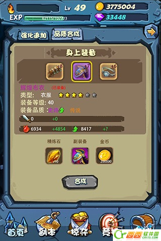 装备合成---装备品质:普通→优良→卓越→史诗→传说,品质依次提高;合成即提升品质,需要一件与主装备相同品质的相同装备充当副装备,外加对应数量的精炼石即可进行,合成后主装备品质提高一级,上限为传说品质(橙色);获得精炼石可通过活动,当然商城也有卖!