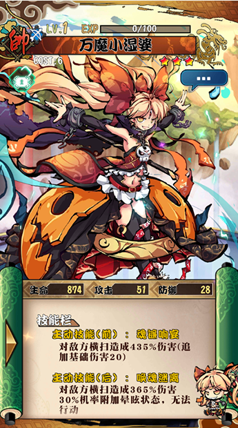 评价:生命百分比损血的Debuff技能对血厚的怪物非常好用,同时50%概率的沉默也有一定的控场效果。自身不错的生命成长和前排被动的回血确保她能够在战场上持续输出。