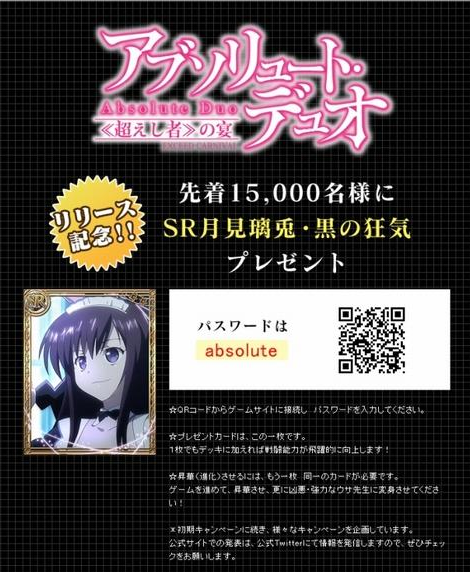 而玩家只要在活动页利用官方提供的QR码连到网站上,并输入官方密码序号“absolute”,即可取得这张具有高攻击力的限定SR卡片“月见璃兔”!由于这张卡片只会送出15000张,因此有兴趣的朋友们就要好好把握机会了!