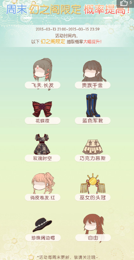 每次在暖暖环游世界的幻之阁里面用钻抽取时,看到抽出来的都是一些高级材料,简直心塞塞有木有!不过暖暖改革后,每期的幻之阁会有限定的衣服提高抽取概率,引起玩家的一致好评,在这个周末到来时,暖暖在3月13号晚上9点,又开启了新一轮的幻之阁限定抽取,这次又提高了哪些衣服的抽取概率呢?还有限时图纸也开始放送,暖粉们一起刷材料做新衣服吧。