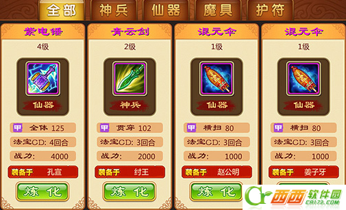 法宝可通过消耗其他法宝进行【炼化】,从而增加法宝经验与法宝升级。法宝等级越高,技能伤害越高。